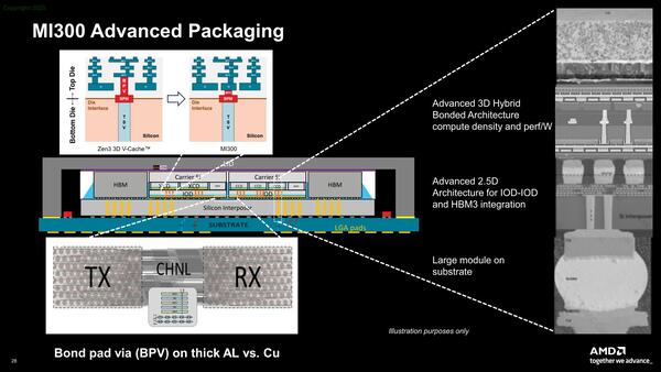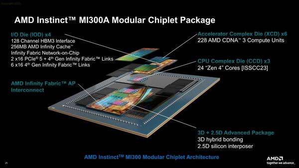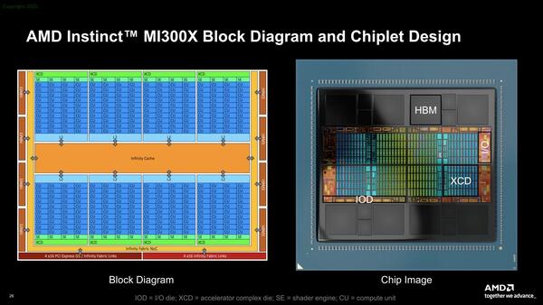 MI300Xの場合、8つのXCD(それぞれ40個のCUを実装)がSoICの形でIoDと接続され、インフィニティ・キャッシュと最小限のレイテンシーで接続される。このIoDにはPCI ExpressとHBM3EのI/Fも搭載され、インターポーザー経由でHBM3Eと接続される。