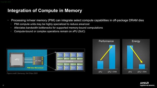 アーキテクチャー的にも、すでにデータフローは広範にAIプロセッサーで使われているが、より一層の性能消費電力比改善にはPIM(Processor in Memory)の方向性に進むとしている。
