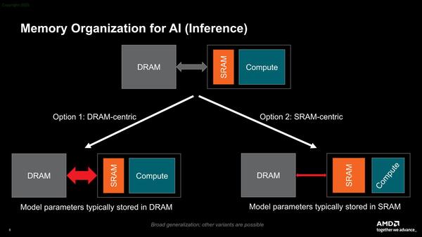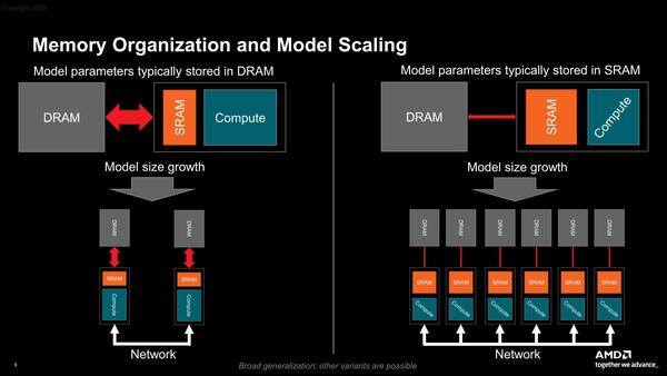 このRAMをSRAM主体にするか、DRAM主体にするかというのが次の問題。一般論としてAIプロセッサーはSRAM主体が多く、GPU系はDRAM主体となる。どちらが良いかは実装に関わってくる問題であるのだが、最近はLLMにおけるWeightの数の急増により、DRAM主体がやや優勢である。