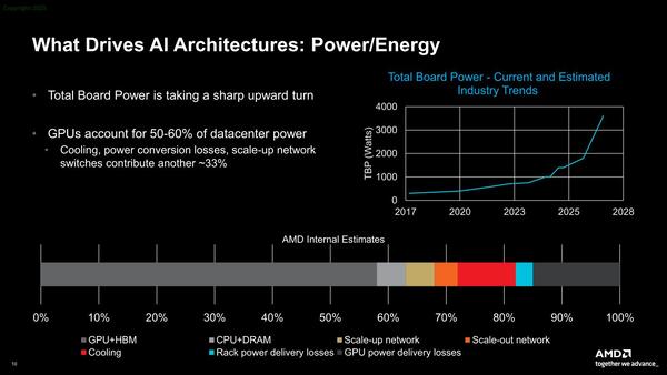 ちなみにプロセッサーの消費電力の内訳が下の画像である。AMDなので当然モデルはInstinct MIシリーズのものと思うが、全体の半分強がGPU+HBMで、残りはその他ということになる。