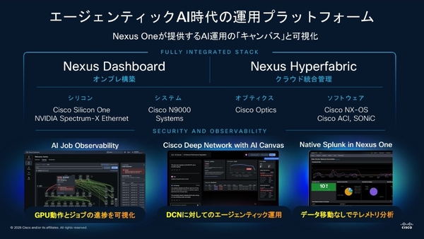 また、運用プラットフォームとして、オンプレミス向けの「Nexus Dashboard」とクラウドの「Nexus Hyperfabric」をフルスタックで展開。統合プレーンの「Nexus One」はネイティブにSplunkに統合されるという。