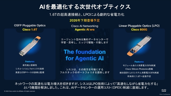 オプティクスの領域では、1.6Tの超高速接続を実現するOSFP Pluggable Optics「Cisco 1.6T」と、DSPを排除することでモジュールあたりの消費電力を50%削減するLinear Pluggable Optics(LPO)「Cisco 800G」が披露された。