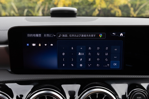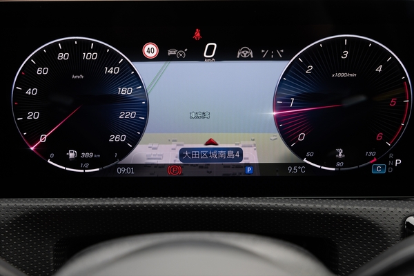 メーターパネルとインフォテインメントをつなげたワイドディスプレイはイマドキ。サイズは10.25インチとちょっと小さいですが、表示内容は上位モデルと同等です。というのも、メルセデス独自のインフォテインメントシステム「MBUX」の最新世代を搭載しているから。「ヘイ! メルセデス!」というと音声で目的地入力できます。