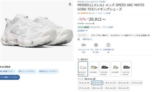 アマゾンでメレルの「SPEED ARC MATIS GORE-TEXハイキングシューズ」を入手