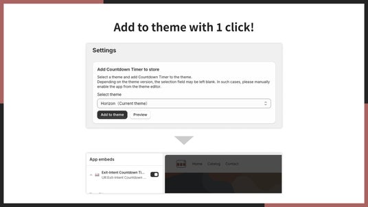 アプリをインストール後、複雑な設定やコード編集は不要。管理画面からワンクリックでテーマに追加でき、離脱防止カウントダウンポップアップをすぐに表示できます。導入に手間や時間をかけることなく、ストア全体へスムーズに反映できるため、初めてアプリを利用する方でも安心です。手軽に導入しながら、ユーザー体験を損なうことなく離脱防止施策を実行し、コンバージョン向上をサポートします。