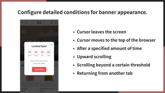 UR: Exit-Intent Countdown Popup は、訪問者がページを離れようとしたタイミングでカウントダウン付きのポップアップを表示し、カート放棄の防止とコンバージョン向上を支援するノーコードアプリです。