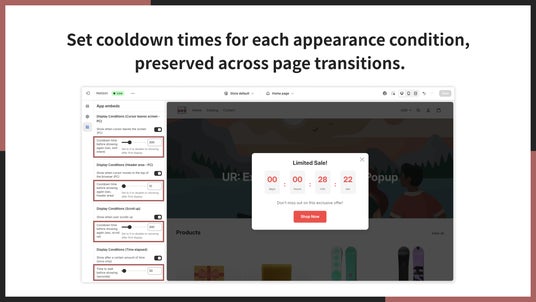 アプリをインストール後、複雑な設定やコード編集は不要。管理画面から出現条件ごとにポップアップの再表示までのクールダウン時間を設定できます。ページを移動してもカウントがリセットされないため、同じポップアップが何度も表示されることを防ぎ、ユーザー体験を損なうことなく離脱防止施策を実施可能です。直感的な操作で簡単に設定でき、ストアの運営方針に合わせた自然で効果的なポップアップ表示を実現します。