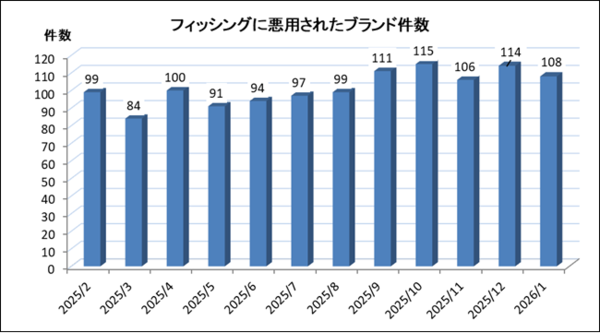 悪用された「ブランド件数」は前月から6ブランド減って108件でした。内訳はクレジット・信販系 24 ブランド、通信事業者・メールサービス系が12ブランド、金融(銀行)系が11ブランド、証券系が11ブランド、オンラインサービス系が9ブランド、そしてEC系が7ブランドとのこと。