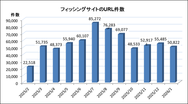 フィッシングメール/SMSの誘導先(偽Webサイト)にあたる「URL件数(重複なし)」は前月から4663件減って、5万822件でした。