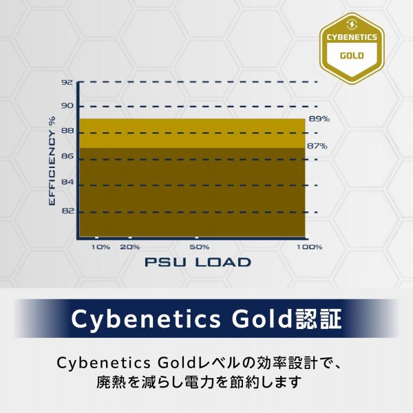 また、電力効率の指標「Cybenetics Gold」認証を取得しており、全体的な効率は87〜89%を確保しています。内部には全て日本製の電解コンデンサーを採用し、40℃の環境下でも連続した1000Wの電力出力を可能にするなど、過酷なゲーミング環境でも安定して稼働する高い信頼性を誇ります。
