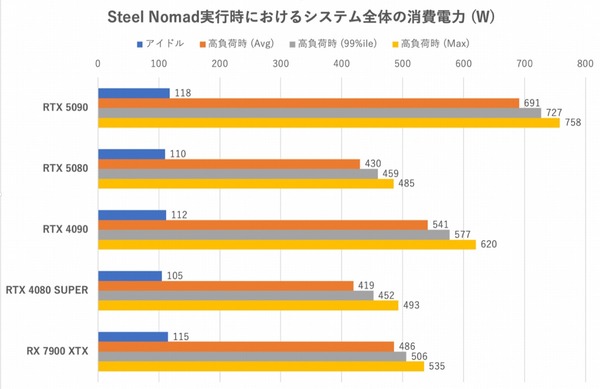 AMD「Ryzen 7 9800XD」とASRock「X87E Taichi」+GeForce RTXシリーズで3DMarkのSteel Nomadを実行した際のシステム全体の消費電力。特にハイエンドグラボでは1000Wクラスの電源が必須だ