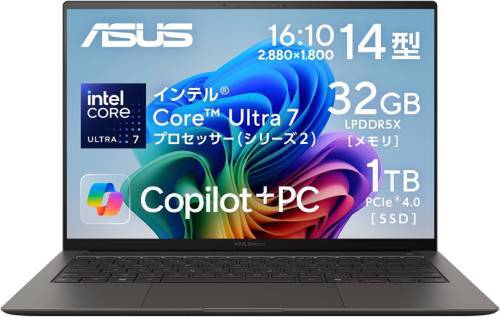 14型で3K(2880×1800)有機EL、しかも120Hz表示。Zenbook S 14 UX5406SAは、その仕様にメモリ32GBと1TB SSDを組み合わせる。約1.2kgの薄型ボディに72Whバッテリーを収め、バッテリー駆動は約23.3時間。Thunderbolt 4×2やWi-Fi 7にも対応する。14型で、この中身。
