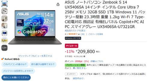 ASUSの14型ノートPC「Zenbook S 14 UX5406SA」が、Amazonでタイムセール対象。参考価格236,182円のところ、11%オフの209,800円で販売中。