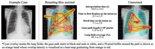 近年、胸部X線をはじめとする放射線画像診断の分野では、病変候補を枠表示などで提示するAI支援システム(CAD)が臨床現場で広く利用されています。これらの表示は診断の補助として有用である一方で、放射線科医の判断を含めた読影プロセスそのものに影響を及ぼしている可能性が指摘されています。そこで本研究では、CAD表示が読影時の視覚探索行動にどのような影響を及ぼすかを、アイ・トラッキングを用いて検証しました。