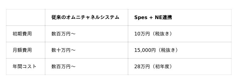 一方、Spesは在庫・出荷・販売データを分断させず、最初から「自動連携」を前提とした設計思想を採用。個別開発、複雑な初期設定、高額な運用コストを前提としない仕組みにより、この価格を実現しています。