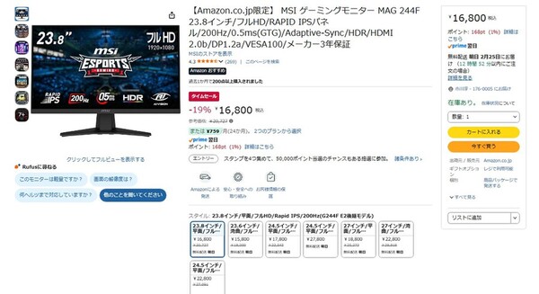 Amazon.co.jpにて、MSIの23.8型ゲーミングディスプレー「MAG 244F【Amazon.co.jp限定】」が販売中だ。参考価格は2万727円だが、タイムセールにより19%オフの1万6800円で購入できる(2月24日時点)。
