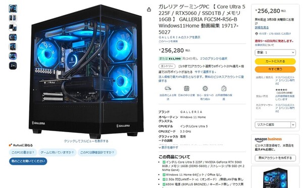 コスパで選ぶならコレ! Core Ultra 5 225F&RTX 5060搭載のGALLERIA製ゲーミングPCをチェック