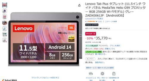Lenovoの11.5型タブレット「Lenovo Tab Plus」がAmazonでタイムセール対象。過去価格39,800円のところ、10%オフの35,770円で販売中。