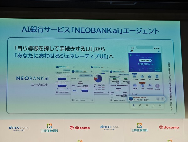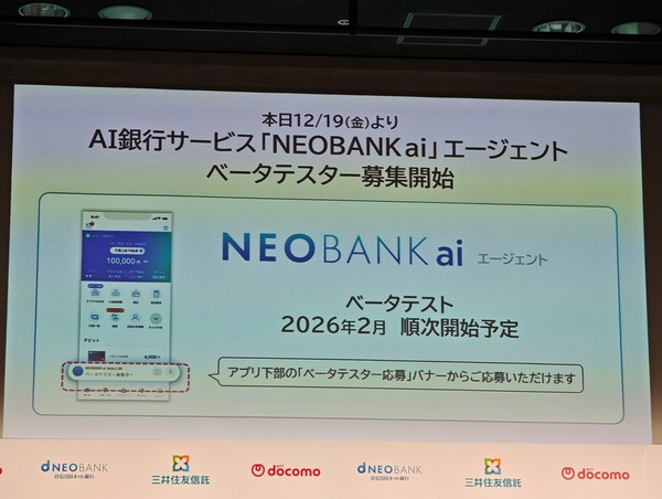 住信SBIネット銀行(8月からドコモSMTBネット銀行)は、2月27日より「NEOBANK ai」のベータテスト版を開始する。テスター募集には数万人が名乗りを上げたが、普段、同行をアクティブに利用している数千人からスタートするという。