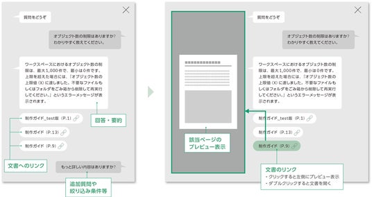 図2:要約した回答と根拠となる文書のリンク、該当ページのプレビュー表示(イメージ図)
