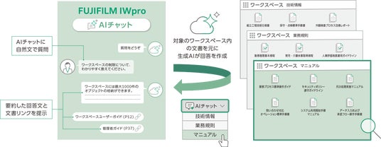 富士フイルムビジネスイノベーション株式会社(本社:東京都港区、代表取締役社長・CEO:浜 直樹)は、クラウドサービス「FUJIFILM IWpro(フジフイルム アイダブリュ プロ)」において、企業内に蓄積された文書情報の探索と活用を支援するAIチャット機能を3月2日より提供開始します。