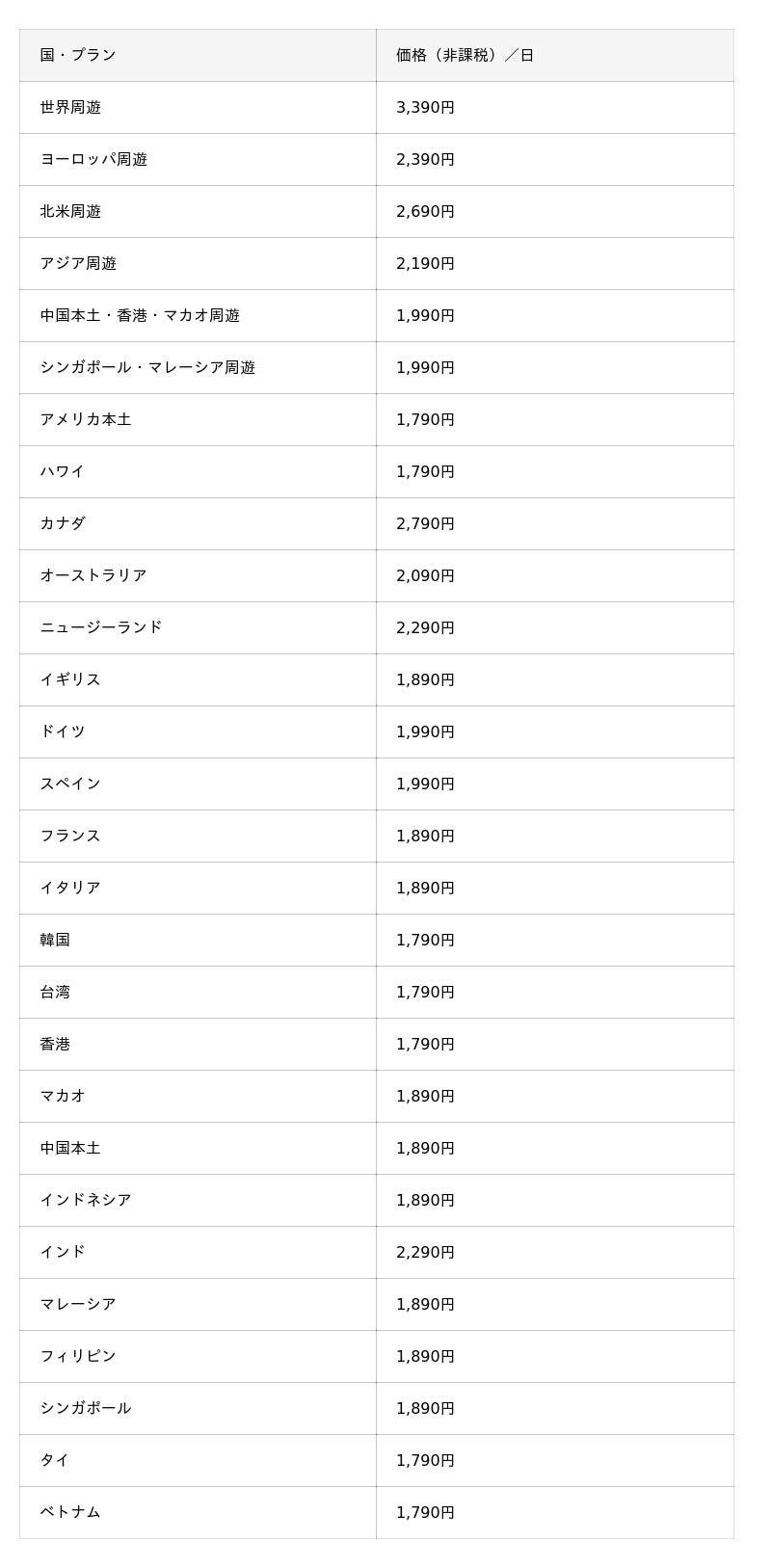 料金は1日1,790円から(アメリカ本土/ハワイ/韓国/台湾/香港/タイなど)。