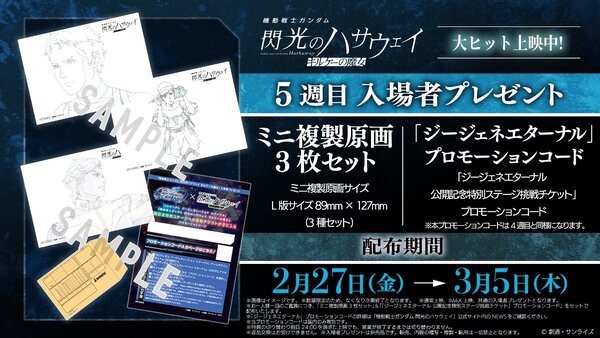 バンダイナムコエンターテインメントは2月24日、現在公開中の映画「機動戦士ガンダム 閃光のハサウェイ キルケーの魔女」(以下、キルケーの魔女)の5週目入場者プレゼントとして、「ミニ複製原画3枚セット」に加え、同社が配信中のiOS/Android向けガンダムシミュレーション『SDガンダム ジージェネレーション エターナル』の「公開記念特別ステージ挑戦チケット」がもらえるプロモーションコードの追加配布が決定したと発表。入場者プレゼント配布期間は、2026年2月27日~3月5日まで(※なくなり次第終了)。