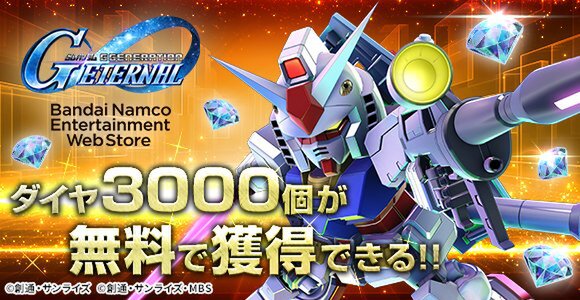 Bandai Namco Entertainment Web Storeにジージェネエターナルが対応。ウェブStoreではゲーム内アイテムがお得に購入可能だ。ウェブStore対応記念に一人1回限定でダイヤ3000個を無料で購入できるキャンペーンも開催中だ。