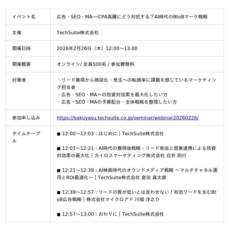 TechSuite株式会社(テックスイート/代表取締役: 畠山夏輝)は、2026年2月26日(木)に3社共催ウェビナー「広告・SEO・MA──CPA高騰にどう対抗する?AI時代のBtoBマーケ戦略」を開催します。