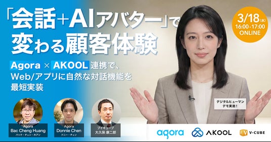 株式会社ブイキューブ(本社:東京都港区、代表取締役社長 グループCEO:間下 直晃、以下 ブイキューブ)は、リアルタイム・エンゲージメントおよび会話型AIのリーディングプラットフォームである「Agora」の国内唯一の独占販売代理店として、運営元であるAgora社(本社:米国カリフォルニア州サンタクララ、CEO:Tony Zhao)と共催で、オンラインセミナー「会話+AIアバターで変わる顧客体験 - Agora×AKOOL連携で、Web/アプリに自然な対話機能を最短実装」を、2026年3月18日(水)16:00~17:00に開催いたします。