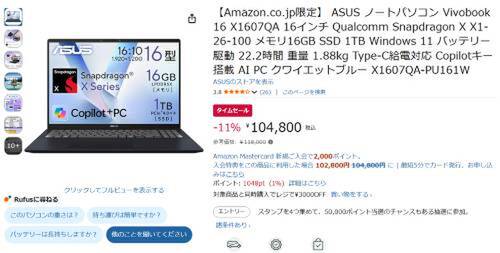 ASUSの16型ノートPC「ASUS Vivobook 16 X1607QA(X1607QA-PU161W)」がAmazonでタイムセール対象。参考価格118,000円のところ、11%オフの104,800円で販売中。