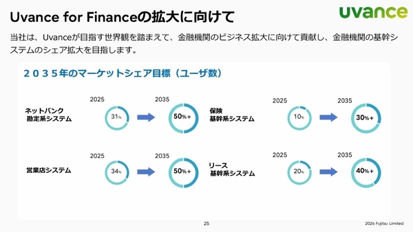 こうした成長の鍵となるコアソリューションの市場シェアについて、Uvance for Financeの立ち上げ時に、10年後の2035年までに、ネットバンク勘定系システムで31%から50%以上へ、営業店システムで34%から50%以上へ引き上げる目標を掲げた。今回紹介した保険基幹システムでも10%から30%以上、リース基幹システムでは20%から40%以上のシェア拡大を目指している。