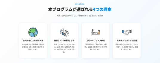 本プログラムの大きな特長は、新入社員のみを対象とせず、上長または育成担当者も同席し、同じ内容を学び、対話する点にあります。