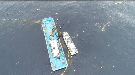 福井県沖のクラゲと漁船。漁網を破壊したり、混獲された海産物の商品価値を下げたりする。