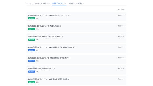 一方、umoren.aiのコンバージョンキーワードは、問い合わせや商談といった具体的な成果を目的としています。対象となるのは意思決定直前のユーザーであり、AI検索で実際に使われる自然文・質問文形式を前提に設計されています。