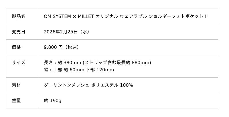 OMデジタルソリューションズ株式会社(代表取締役社長 兼 CEO:杉本 繁実)が展開する映像製品ブランド「OM SYSTEM」は、フランスのアルパインブランド「ミレー」(ミレー・マウンテン・グループ・ジャパン:東京都品川区、代表取締役:ペア・ラスムセン)との共同開発による新製品「OM SYSTEM × MILLET オリジナル ウェアラブル ショルダーフォトポケット II」を、公式オンラインストア「OM SYSTEM STORE」および「楽天市場 OM SYSTEM 公式ストア」にて、2026 年2月25日より発売します。