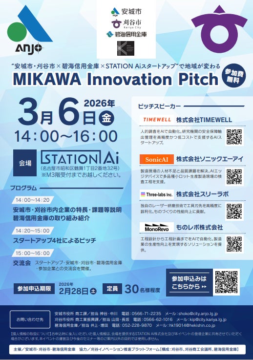 「MIKAWA Innovation Pitch」は、安城市・刈谷市・碧海信用金庫・STATION Aiが連携し、スタートアップ企業と地域企業とのオープンイノベーションを創出することを目的としたピッチ