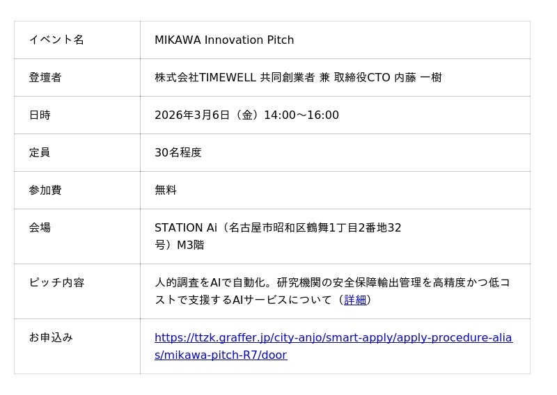 【愛知】株式会社TIMEWELL、3月6日開催「MIKAWA Innovation Pitch」に登壇し、AIで自動化する安全保障輸出管理サービスについて紹介!