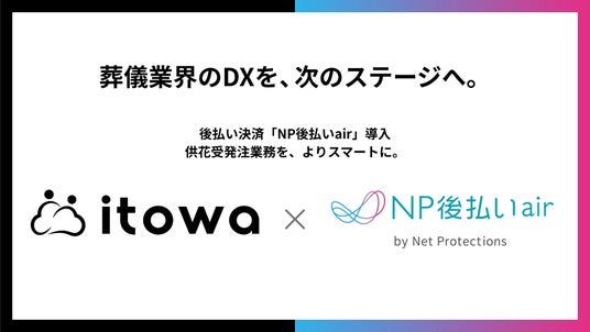 株式会社itowa(本社:愛知県名古屋市、代表取締役:坂元 充、以下「itowa」)は、株式会社ネットプロテクションズ(本社:東京都千代田区麹町、代表取締役:柴田 紳、以下「ネットプロテクションズ」)と、葬儀業界における業務効率化およびDX推進を目的とした業務提携を締結したことをお知らせいたします。