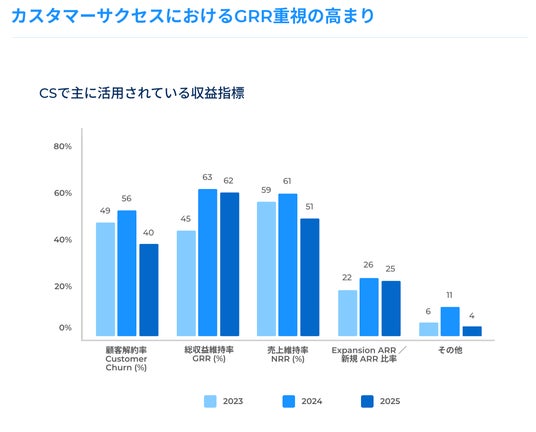 - GRR(売上維持率)の重要性が拡大、2023年45%から2025年62%へ増加:KPI領域では、GRR(Gross Revenue Retention)を主要指標として採用する企業が2023年の45%から2025年には62%へ増加しました。GRRは拡張を除いた純粋な顧客維持力を測る指標であり、企業がより安定的かつ予測可能な成長モデルを重視している傾向を示しています。また、非収益指標ではCSQL(Customer Success Qualified Leads)が急速に台頭し、CSが将来の収益機会を創出する存在であることを可視化する指標として注目されています。