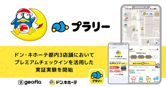 ジオフラ株式会社(本社:東京都千代田区、代表取締役社長 社長執行役員CEO:尾崎 雄一、以下 ジオフラ)は、株式会社パン・パシフィック・インターナショナルホールディングス(本社:東京都渋谷区、代表取締役社長CEO:森屋秀樹、以下PPIH)が展開するドン・キホーテ3店舗において、おでかけエンタメアプリ『プラリー』のリテール向け来店促進機能「プレミアムチェックイン」を活用した実証実験を開始したことをお知らせいたします。本取り組みでは、店舗へのチェックイン体験を通じて来店動機の創出および購買促進を図るとともに、来店状況や顧客傾向の可視化を通じたリテールDXの可能性を検証します。