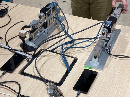 本実験では、ハンド型のフォロワーとその操作部であるリーダーを用いて、硬い木片を把持したあと、ハンドを素早く操作して印加する力を変動させながら定められた時間内に運搬するという定型的なタスクを、Configured Grantを入れた5G SAを利用した場合、Configured Grantを入れていない通常の5G SAを利用した場合の2通りで実施し、両者の違いを比較しました(図3)。