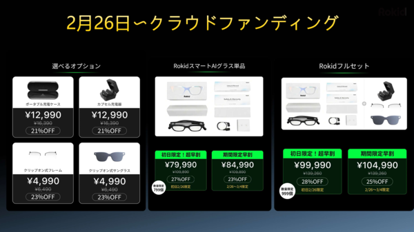 気になる価格だが、2月26日からクラウドファンディング形式で発売し、単品だと初日は27%オフの7万9990円、以降3月4日までは23%オフの8万4990円、充電カプセルやクリップオン式フレーム、クリップオン式サングラスなどが同梱するフルセットは、初日は28%オフの9万9990円、以降3月4日までは25%オフの10万4990円で購入可能だ。