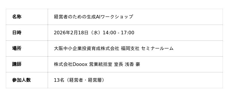 『緊急ではないけれど、重要な課題』について、企業経営者に伴走する特命社長室(R)︎を展開する株式会社Dooox(本社:東京都品川区、代表:久保寺亮介/以下「当社」)は、2026年2月18日(水)、大阪中小企業投資育成株式会社(本社:大阪市北区、代表:小林 利典)九州支社にて、投資先企業の経営者・経営幹部を対象とした「経営者のための生成AIワークショップ」を開催いたしました。福岡県のみならず、熊本県・長崎県・沖縄県から計11社の経営者にご参加いただき、3時間にわたり最新の生成AIツールに自ら触れながら、経営課題の解決に向けたワークに取り組みました。