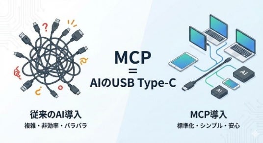 MCP(Model Context Protocol)とは、Anthropic社が発表した、AIと業務ツールを標準規格で接続するためのプロトコルです。「AIのUSB Type-C」とも称され、あらゆる業務ツールをAIと一元的に繋ぐことが可能になります。