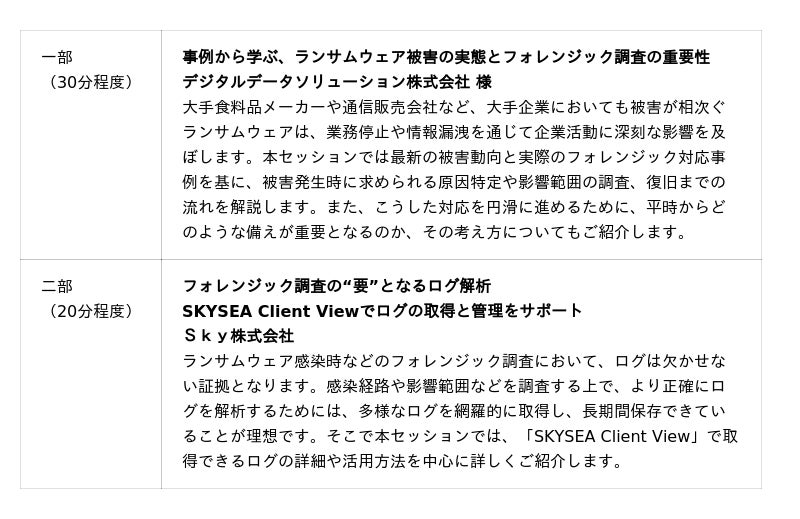 3月開催のセミナーでは、ランサムウェア感染時などに原因や被害の全容を調査する「デジタルフォレンジック」について解説。実際の事例を参考に、被害発生時に求められる原因の特定や影響範囲の調査などについてデジタルデータソリューション株式会社様に解説いただき、弊社からは「SKYSEA Client View」が支援できる日々の備えについてご紹介します。そのほか、2025年のサイバーセキュリティに関する法整備の振り返りや、2026年度に運用開始予定の「サプライチェーン強化に向けたセキュリティ対策評価制度」に関する最新情報など、さまざまなトピックでセミナーを開催。ぜひご参加ください!