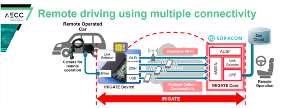 「IRIGATE」は、自動車業界をはじめとするAECC(Automotive Edge Computing Consortium)のメンバーとの連携により、コネクテッドカー向けに開発された新たな通信プラットフォームである。クラウド上のIRIGATEコアとIRIGATE端末が接続を確立することで、認証、課金、ルーティングなど、通信事業者と同等の管理と運用を可能にする特長を持つ。