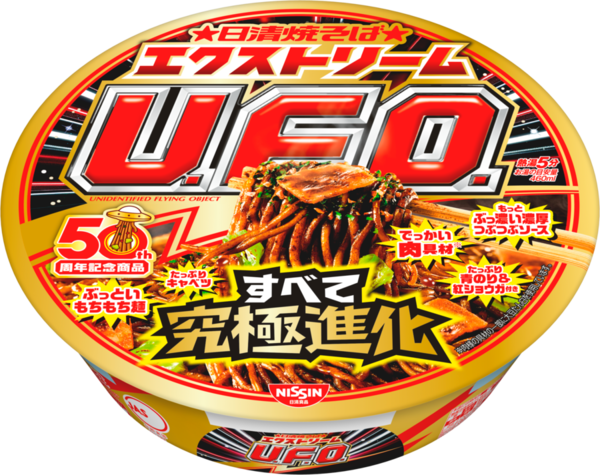 「日清焼そばU.F.O.」は1976年に発売されたロングセラーカップ麺ブランド。今回、50周年を記念した商品として、ソース、麺、具材、ふりかけのすべてを "究極進化" させた限定商品を展開する。