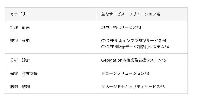 1.体系化これまで個別に提供してきた多様な社会インフラ保守に関する「管理・計画」「監視・検知」「分析・診断」「保守・作業支援」、そして「防御・統制」に至るまでの既存のソリューション群を、お客さまの課題起点で横断的に組み合わせた提案が可能になります。お客さまの多様な課題に対応するため、以下のカテゴリーのソリューション群を提供します。