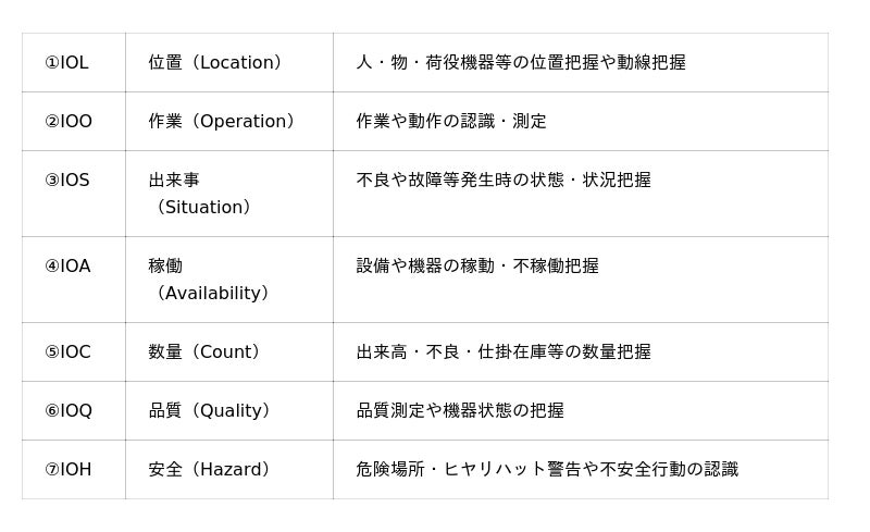 IoT7つ道具とは、現場で可視化したい情報を、1.位置(Location)、2.作業(Operation)、3.場面・状態(Situation)、4.数量(Count)、5.危険(Hazard)、6.稼働(Availability)、7.品質(Quality)という7つ視点で整理しています。
